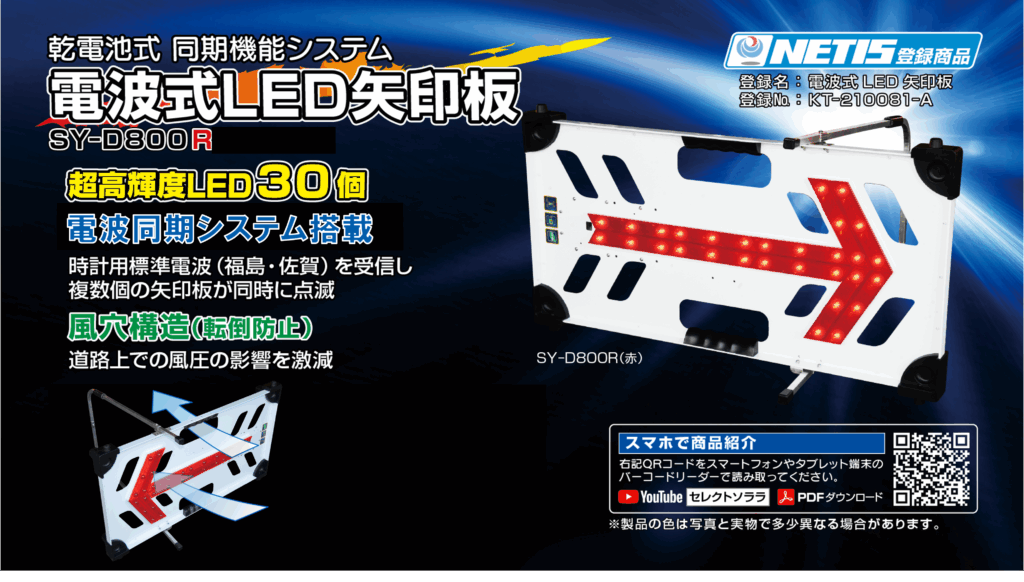 時計用標準電波(福島・佐賀)を受信し、複数個の矢印板が同時に点滅。運転者や通行人が道路の境界線や工事区域を容易に認識することができ、安全を確保しやすくなります。