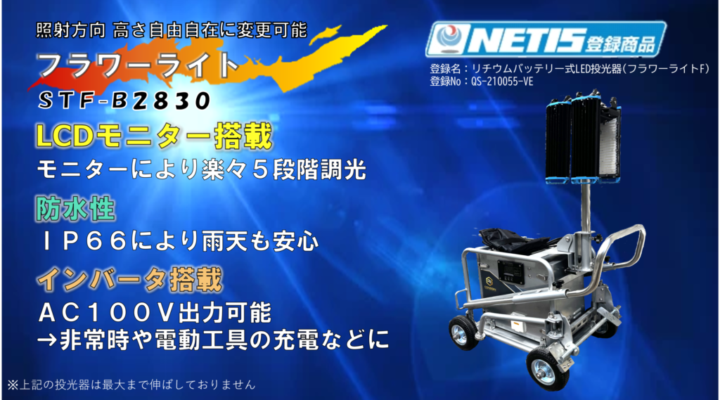 アウトリガーが地面に接地することで、風や振動による転倒リスクを大幅に低減。また、不整地や傾斜地でも安定して設置可能になり、照射位置の柔軟性が向上。